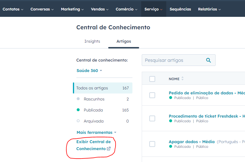 - Para a consultar basta: Serviço -> Central de Conhecimento -> “Exibir Central de Conhecimento”