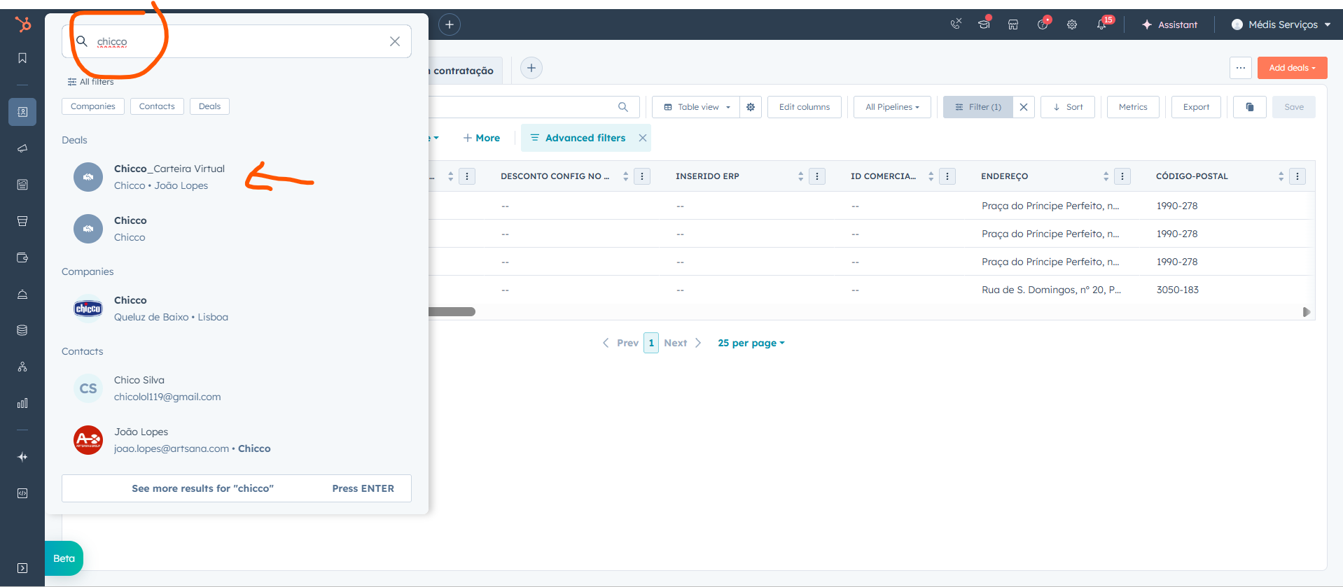Para verificarmos a informação, podemos pesquisar pelo nome do parceiro e entramos no deal/negócio.