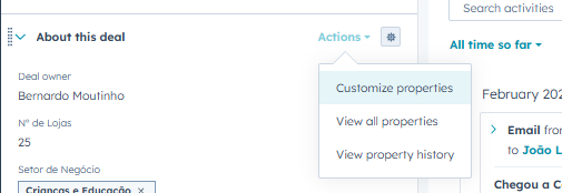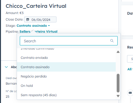 E no property history também podem ver os vários estados (Etapa) do deal/ negócio. Ou seja, se por acaso deixar de ter acordo, o stage vai mudar para "négocio perdido" .