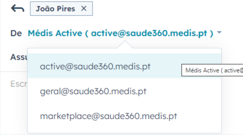 Ao enviar um e-mail ao Cliente, é necessário ter em atenção a seleção do endereço que se pretende utilizar como remetente (Marketplace, Geral ou Médis Active).