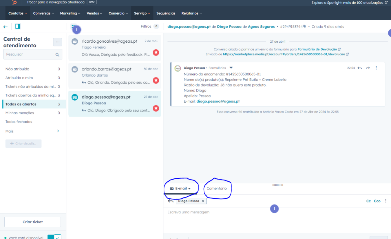 Nota importante: quando o e-mail é enviado através do ticket visualizado na Central de Atendimento, é necessário ter em atenção que existem dois campos: “E-mail” e "Comentário”: