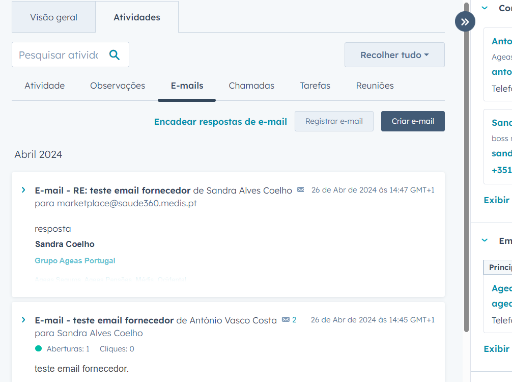Desta forma, o e-mail fica registado e, quando existir resposta, é automaticamente arquivada no histórico dos e-mails, dentro do respetivo ticket.