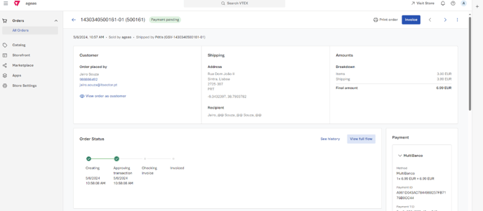 Ao clicarmos na encomenda pretendida, conseguimos ver toda a informação associada a mesma: os dados do cliente, a morada de entrega, o estado da encomenda, o valor pago/meio de pagamento e códigos promocionais utilizados;