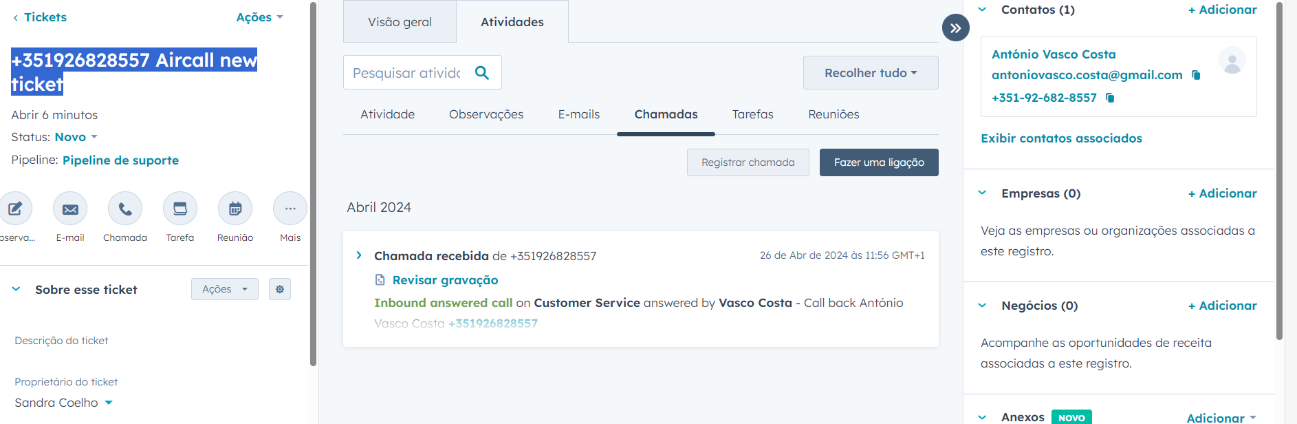 Quando uma chamada é atendida pelo Customer Service, é automaticamente aberto um ticket no HubSpot, através do qual será registada toda a informação daquela chamada e será tipificado o tema em questão.